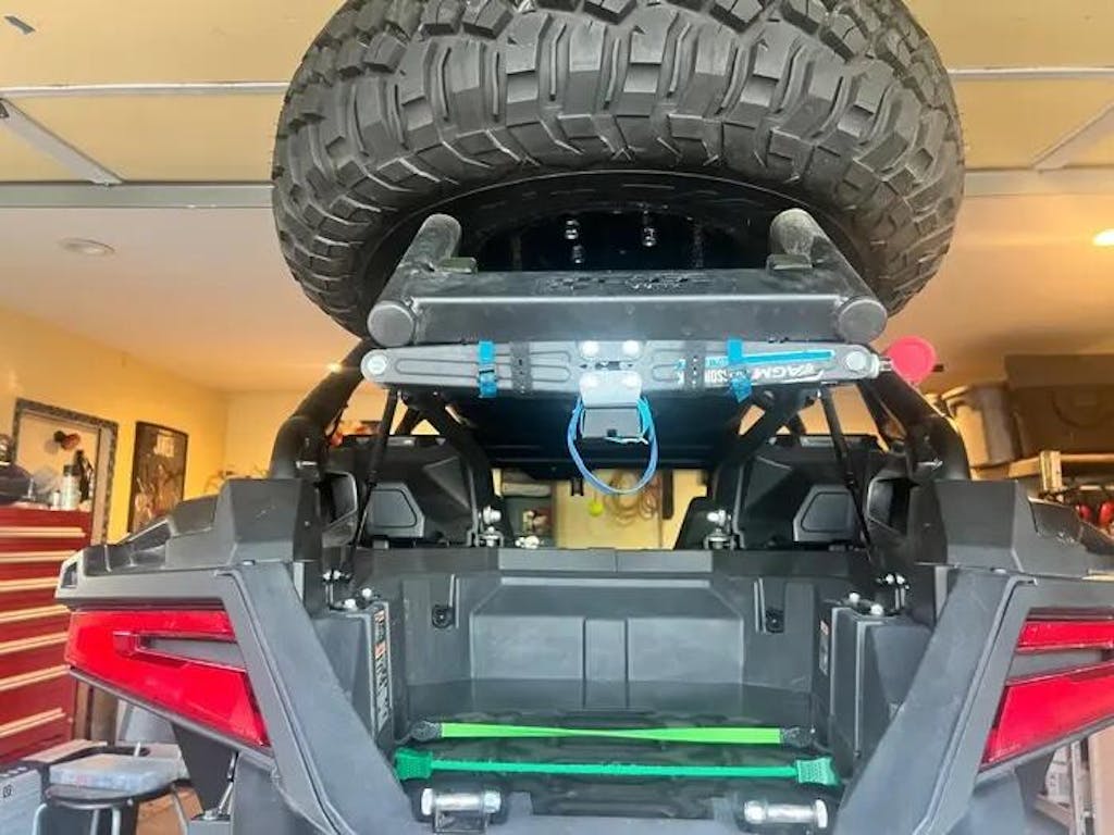 Mounts perfectly between the seats and the sand pad comes off easily so I throw that in my boxes with the impact.